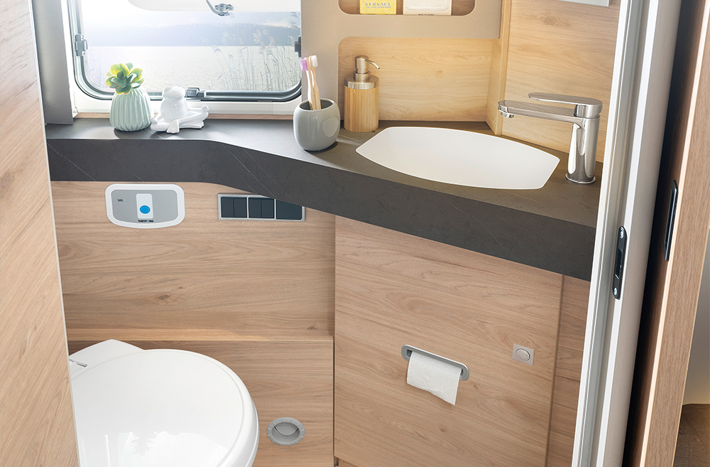 - På alle 7057-modeller er der mulighed for soveafdeling og baderum, dvs. der er mulighed at lave et helt lukket badeværelse på tværs i autocamperen