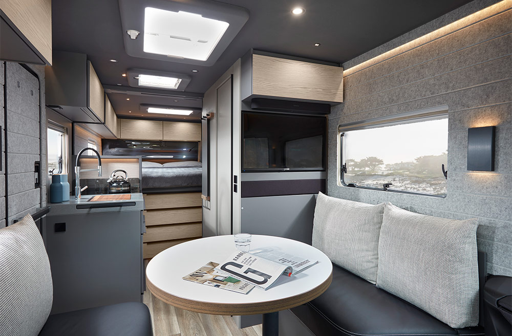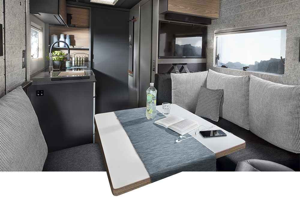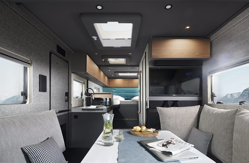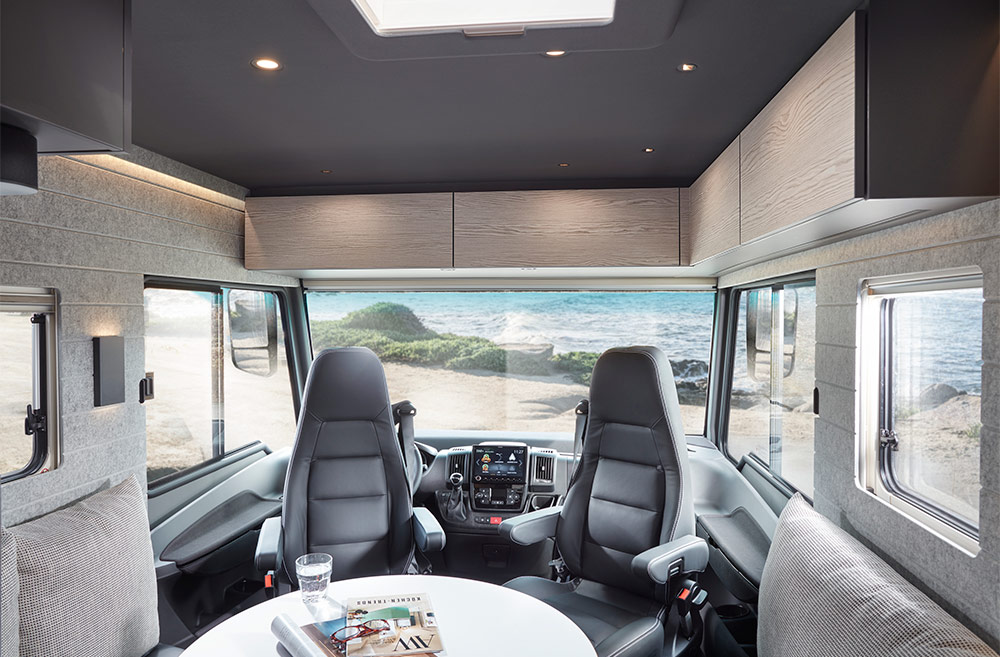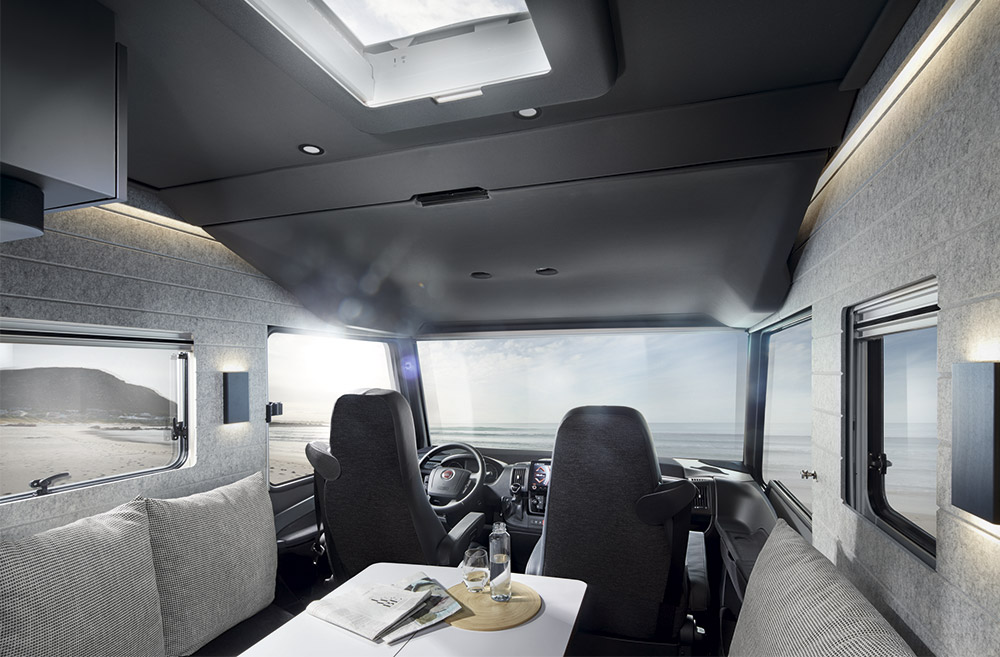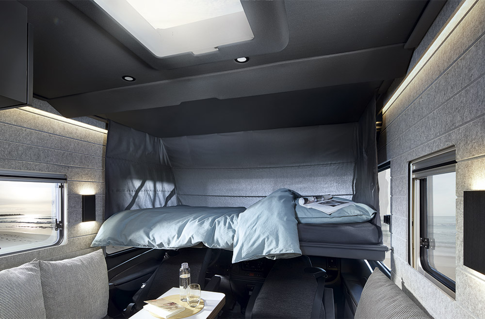Det er særligt i iSmoves interiør, at du vil kunne opleve de innovative detaljer og komfortable løsninger. Der er frit udsyn gennem hele køretøjet og plant gulv fra førerhus til sengeafdeling. Belysningskonceptet med de moderne glaspaneler, der styrer projektørerne i det antracitgrå loft, sørger for en hyggelig atmosfære om aftenen. De filtbelagte vægge giver en behagelig, naturlig akustik.