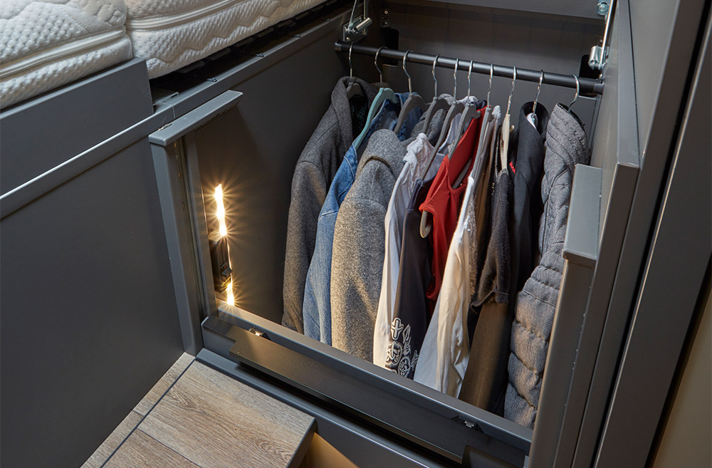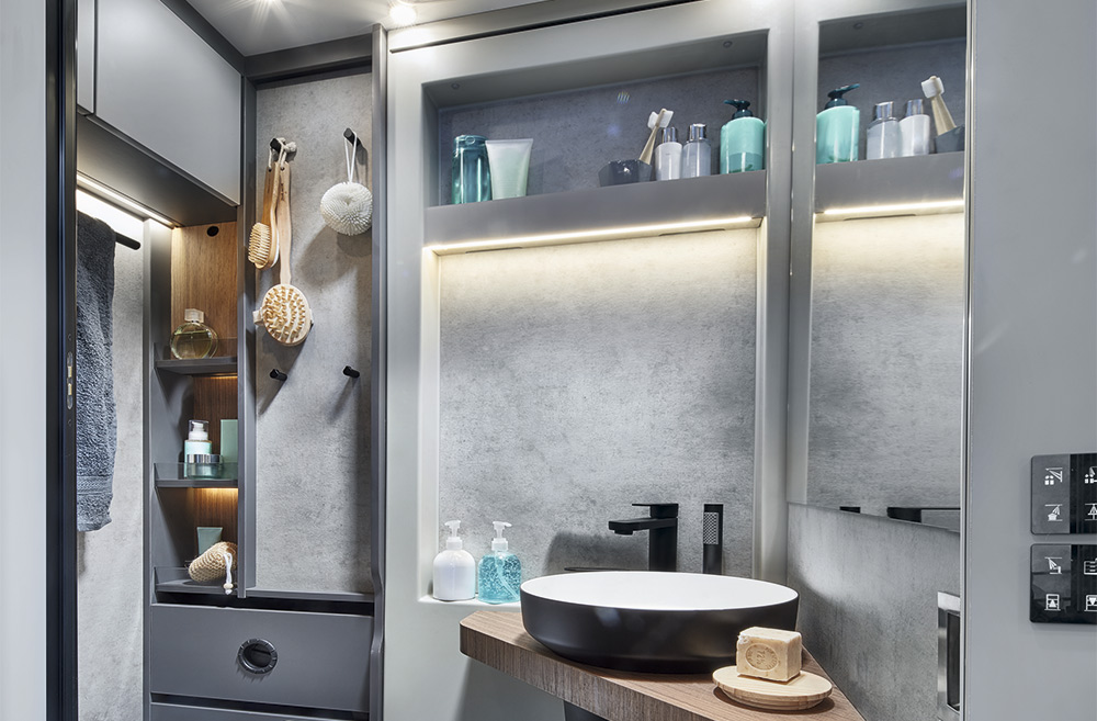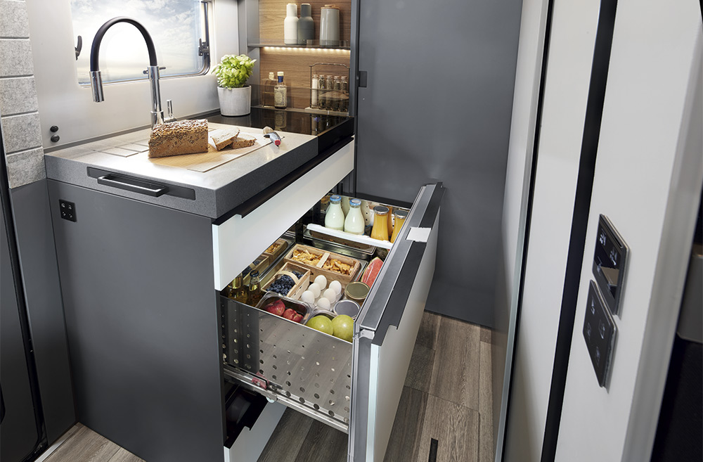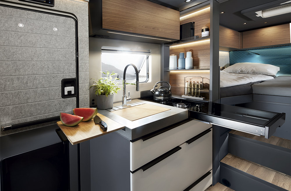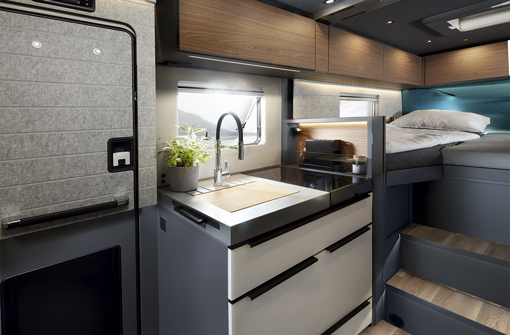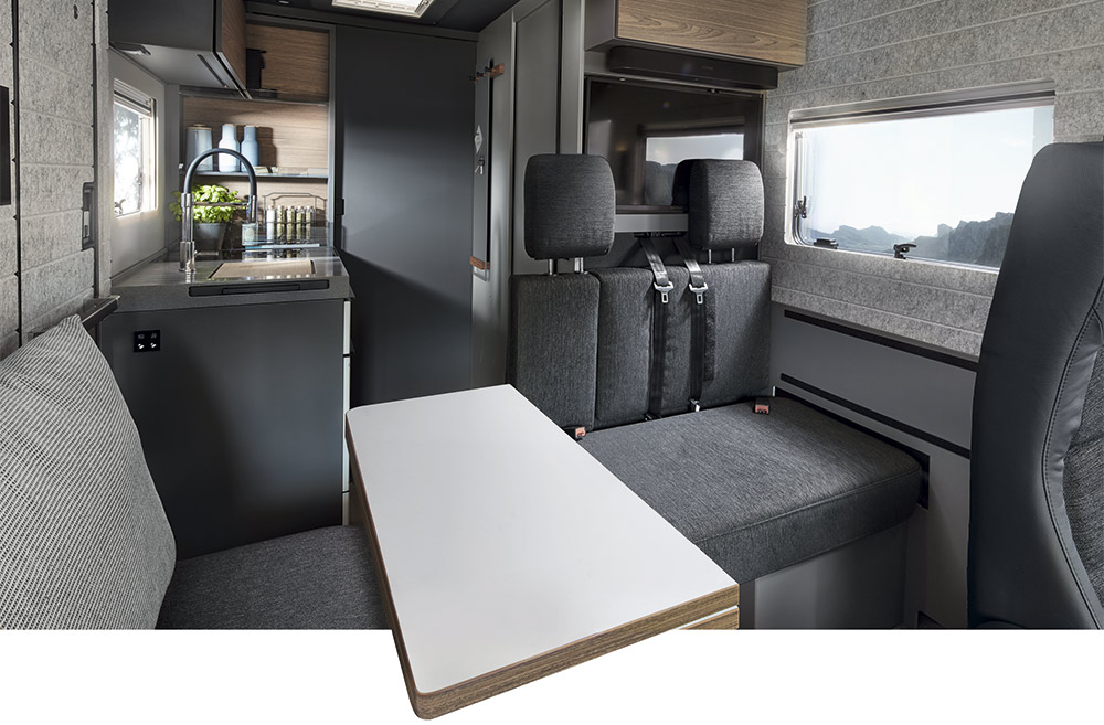 Det er særligt i iSmoves interiør, at du vil kunne opleve de innovative detaljer og komfortable løsninger. Der er frit udsyn gennem hele køretøjet og plant gulv fra førerhus til sengeafdeling. Belysningskonceptet med de moderne glaspaneler, der styrer projektørerne i det antracitgrå loft, sørger for en hyggelig atmosfære om aftenen. De filtbelagte vægge giver en behagelig, naturlig akustik.