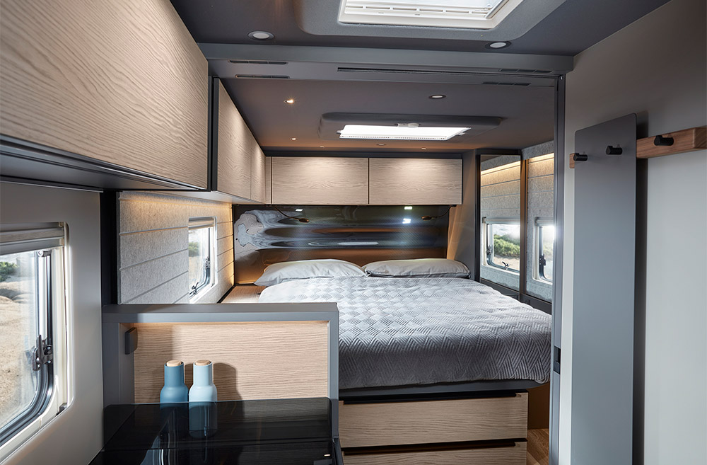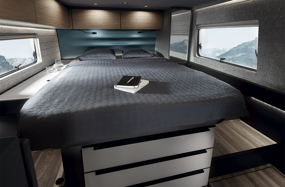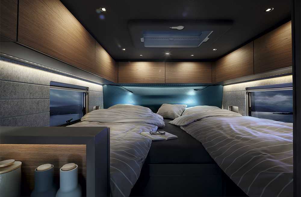iSmove fås i 2 grundrids med enten komfortable enkeltsenge eller dobbeltseng og 2 personers sænkeseng over førerhuset.