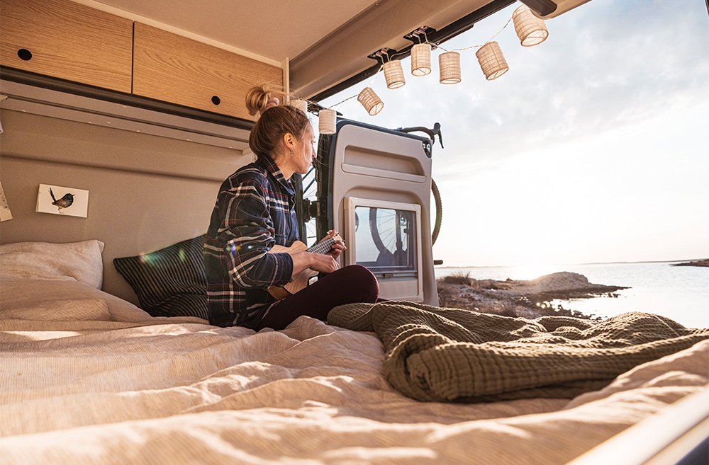 - Tagluge: Panoramaet kan nydes fra vinduet i sovetaget, der også fungerer som ekstra lyskilde i bodelen. Udstyret med myggenet og mørklægningsgardin
