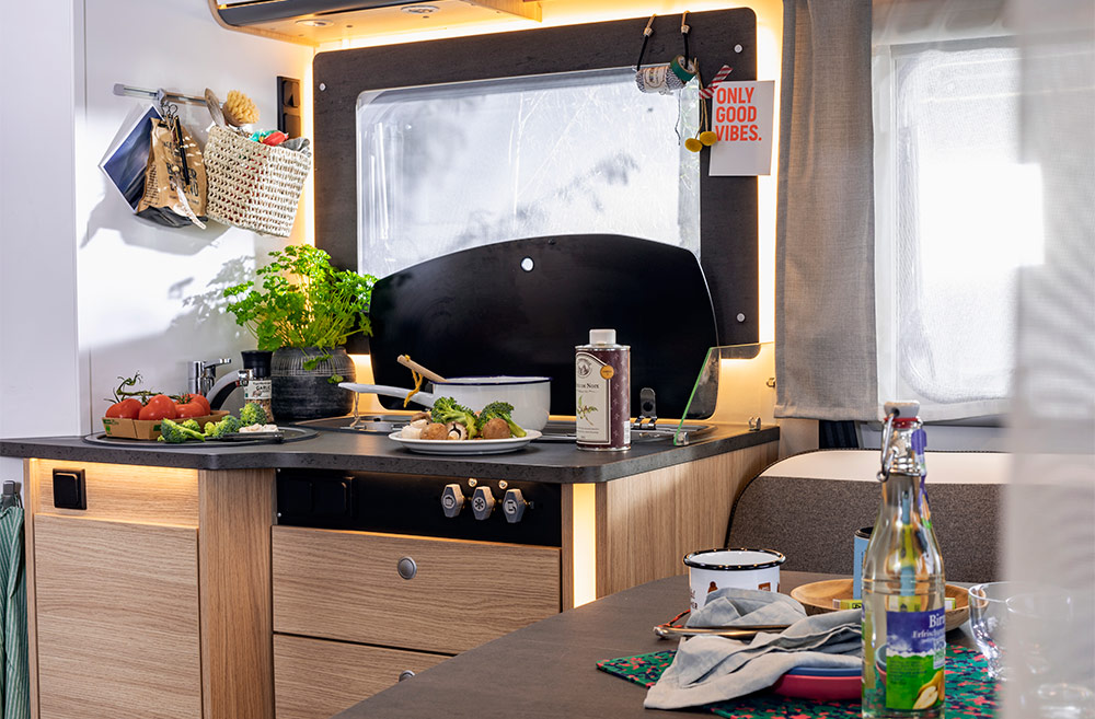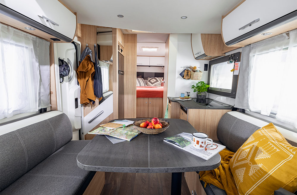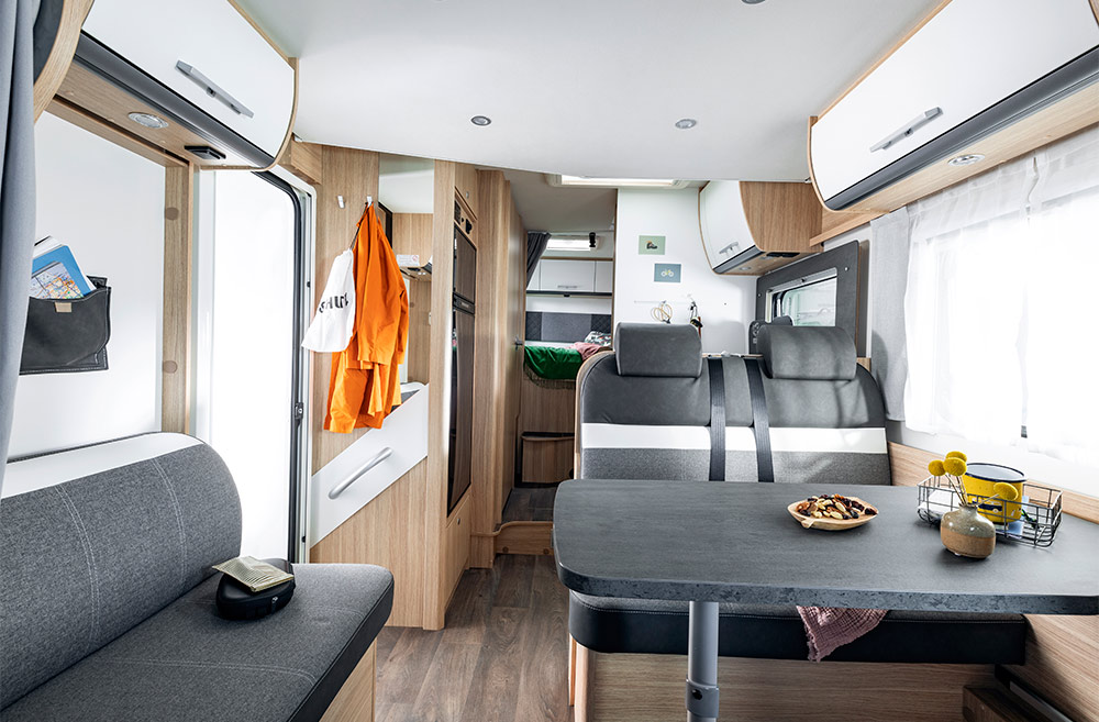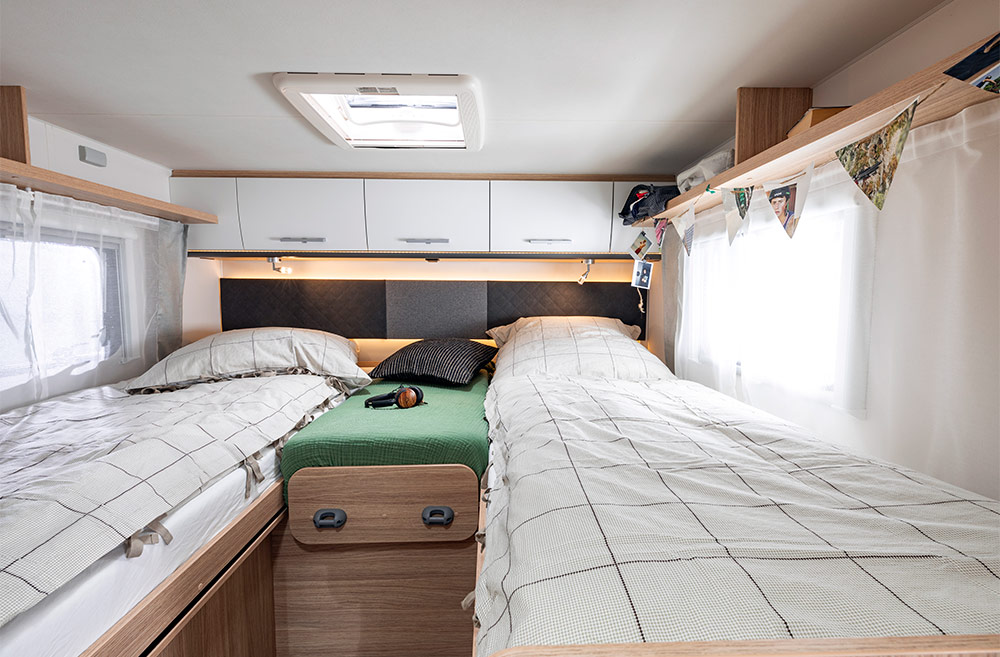 Delintegreret Adventure Edition fås i 3 grundrids med enten enkeltsenge eller fritstående dobbeltseng (queens bed), der kan suppleres med en 2 personers sænkeseng over siddegruppen som ekstraudstyr.