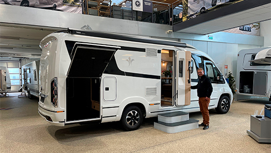 Vores 1800 m2 store butik og udstilling er fordelt over 2 etager samt et stort udendørsareal med masser af autocampere og campingvogne.